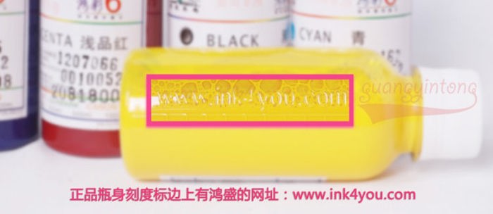 2、正品瓶身刻度标边上有鸿盛的网址:www.ink4you.com